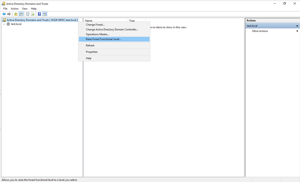 - Right-click on Active Directory Domains and Trusts (top node) and select Raise Forest Functional Level.